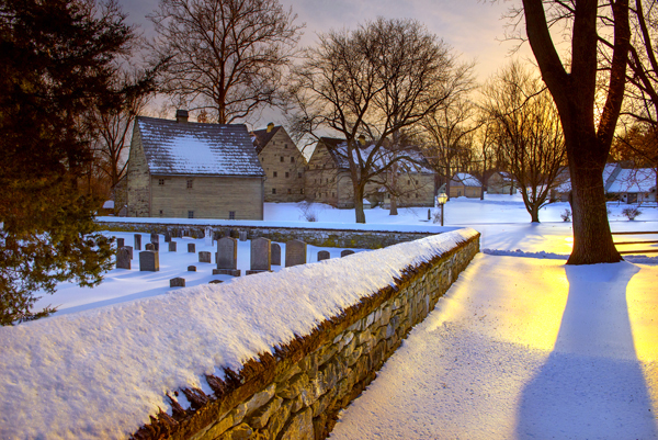 This view of the Historic Ephrata Cloister includes the cemetery surrounded by the stone wall. The one thing I always remember about their sleeping habits is they used wooden blocks as pillows. Try that sometime!