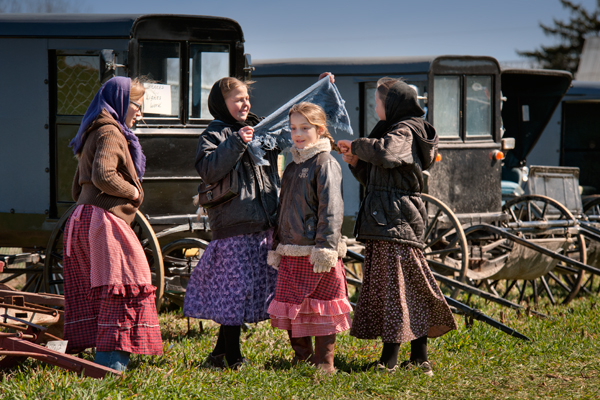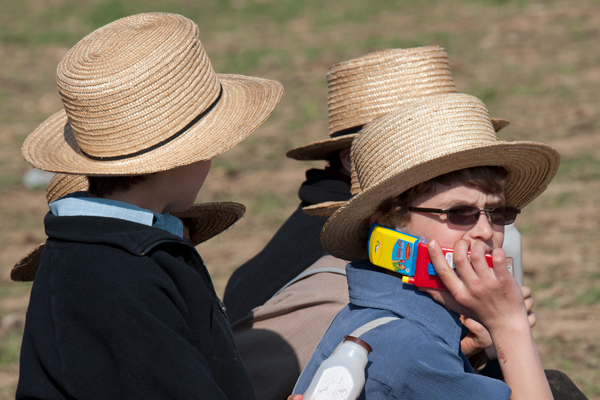 I photographed this group of young Amish girls and guys at the mud sale last week, and they were quite interested in this cell phone candy holder that was being sold at the sale food stands. It was a plastic case that resembled a cell phone ,but only held candy inside. I saw several groups of Amish kids acting like they were making calls throughout the day, and the item was a big hit with them. These girls wearing their colorful bonnets were immersed in looking at this interesting item. I added the boy using his candy filled cell phone at the last-minute so viewers can see it better.