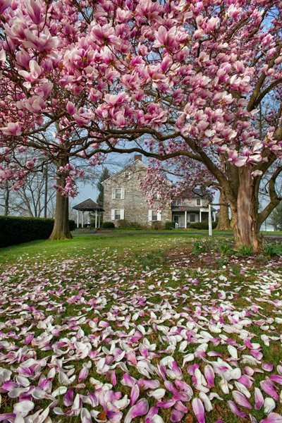 Today started out with dense fog enveloping the countryside, and unfortunately I did not get a lot of time to seek out foggy scenes in the early morning hours. I did come across this lovely magnolia tree in full bloom at the Hibshman farm in Lancaster county,Pa. The farm includes the original farmhouse,wash-house,stone barn, tobacco shed and barn, and a second farmhouse. The oldest section dates from 1750,and the second section was built around 1801. I knocked at the door to get permission to snap a few shots and a caregiver there was very accommodating. The sun burst out shortly after I arrived, so I was hoping for better light but it was somewhat soft light for these shots. This farm was preserved from development and is listed on the national register of historic places. The magnolia blooms will soon be completely on the ground after blooming early this spring. For budding photographers following me, I want to mention to be critical when composing your shots,and if you take note here, I made sure the chimney on the house did not overlap the branch. little things like that can make or break a shot sometimes.