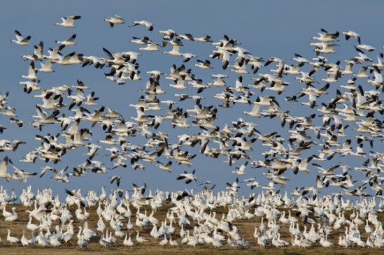 I decided to go see what the snow geese situation was this evening, and I was lucky enough to see them take to the air en-masse several times. Several people mentioned that overall numbers may be declining as several weather fronts have come through and many times the birds follow these currents northward. It’s hard to see any detail in this small a photo, but it was great to see hundreds of birds take to the air at once. I shot the image at f8 at a 2000th of a second, and this is only a tiny percentage of the group.