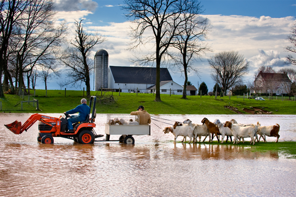 We had a decent amount of rain over the last two days,so my mind started thinking about all the heavy storms we had in the last year, and this image came back to my memory. What appears to be a lake, is actually a field for this herd of goats, and over near the green grass there was a tiny stream that severely overflowed its banks. As the goats were down to their last few feet of pasture, the owners came out with the tractor and cart. They loaded the young ones in the wire cages, and persuaded the nervous parents to follow them to higher ground. It was comical to watch, but the waters were still rising,so they got out at just the right time.