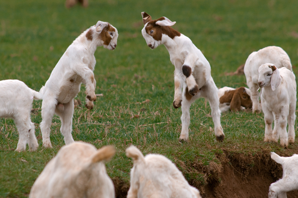 Well this is the time of year when the newborn critters make their appearance, and usually warm weather brings out the playful side in them. These baby goats were full of energy from the warm sun, and a good round of head butting was just what they needed to do to burn off some extra energy. It’s always funny watching them size each other up, and then rise up to give a good smack to the nearest competitor. This was one of those rare times when the recipient was ready to fire back.