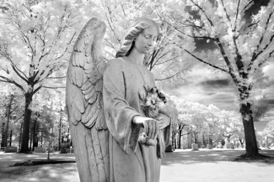 As spring advances and trees and grass begin to green up, I start thinking about shooting infrared images.The green foliage turns white in infrared, creating a very unique look. I have found that some of the Victorian era cemeteries can look quite stunning when shot in infrared, and todays post is one such example. This is Calvary cemetery outside New York City, and features very impressive statuary, monuments and carved stones. I have a black backpack and often set it down while I am shooting, and more than once I have gone into panic mode as I wander a bit and realize I forgot where I set my bag. Try finding a bag amongst thousands of dark stones and you quickly remember to wear your bag when you move around. I always go with a friend, and we usually shoot different subjects, so at least once a trip I wait till he is in deep concentration looking through the camera, and I sneak up and suddenly grab his arm or talk in his ear, and of course he returns the favor. This particular cemetery goes on for acres and includes 3 million burials.The large mausoleum on the left is that of the Johnston family. the following is from the internet about this family and where my title came from.