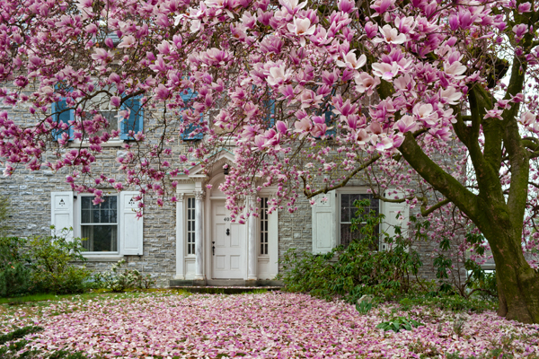 Weatherman was calling for rain yesterday, but when I woke it was just overcast with a slight breeze, so I headed out to look for photo possibilities. After becoming frustrated with increasing breezes most of the morning, things finally calmed down a bit and just in time for another sighting of a beautiful magnolia at peak or just past peak . The stone home with blue shutters was a perfect complement to the pink hues of the tree, and the carpet of freshly fallen petals made it a must shoot scene.