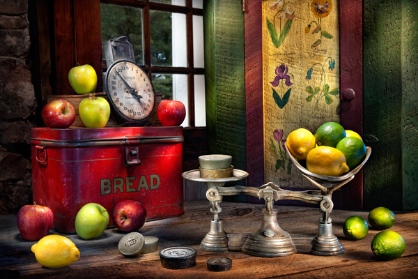 Today I visited a local florist that is planning to open an antique shop in the near future, and he graciously allowed me to look through his collection for possible photo subjects. I saw the old scale first and then selected several items to add some balance and color to the shot. I have no idea where some of my ideas come from, but I decided fruit would look neat on the scale, so I zipped over to a nearby produce stand and picked up a selection of limes,lemons and apples. For budding photographers taking notes, I light painted this shot using my small flashlight, and because the room had numerous windows, I used a 3 stop neutral density filter on the lens, which allowed me to shoot exposures around 8 seconds each. The window directly behind the shot was covered by black fabric till the very end, and then the exposure for the window portion was simply painted in on lighten mode in layers in Photoshop. Thanks to Kerry for giving me free reign in the shop.