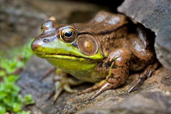 This is the resident frog at my mother in laws house who has laid claim to her tiny backyard pond. He has been affectionately named croaker for obvious reasons and my mother in law has almost perfected the mating call that emanates from croaker on a normal night. I used to have a backyard pond as well, and was always amazed how frogs found their way to these small sources of water. For this hand-held shot, I had to all but fall in the pond to get the low angle, but croaker gladly posed as I was about a foot away, and never even flinched.