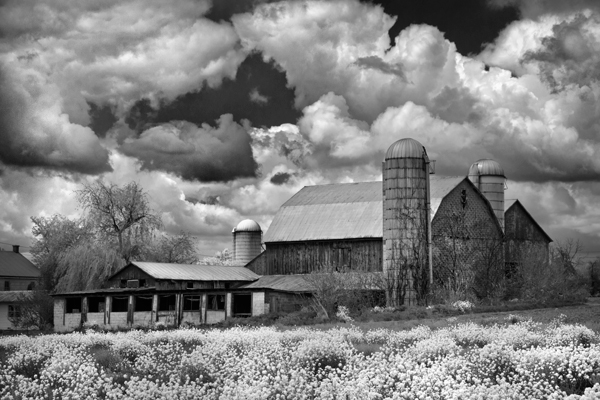 I spotted this lovely field of goldenrod on a drive through the country this evening, and knocked at the farmhouse door to get permission to walk to this spot. Thankfully, the owners obliged and I took a series with the billowy clouds accenting the scene. I tried to get a sunset shot as well, but the light was terrible, so we will see if I can salvage anything from that attempt. I might go out at sunrise this morning to try again, but it will be hard to beat this shot with the great skies. Everyone sees shapes in clouds at times, and I thought it almost looked like a cross above the farm, which I thought was kind of neat the way it was positioned in the center of the blue sky. I don’t usually add photos after the fact,but my friend gave me grief about forgetting my infrared camera so I worked on one to simulate that look.