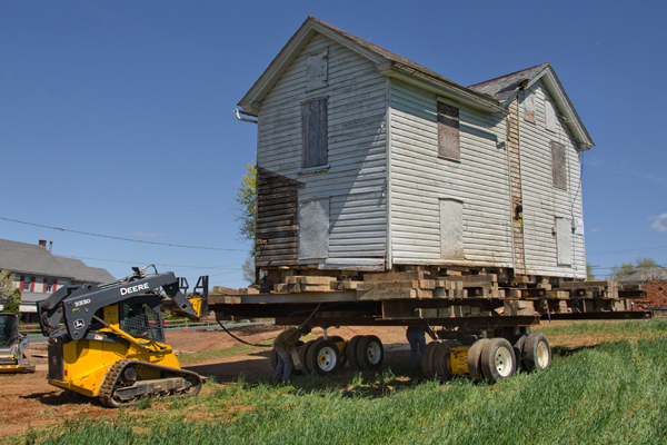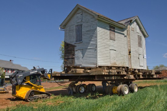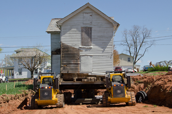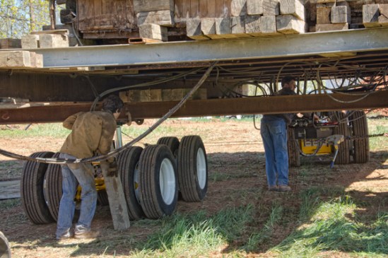 This home was moved approximately 100 yards on thursday by some very cool equipment. The hydraulic setup is somehow controlled by the skid loader or someone underneath the house using a control panel. The wheels drove the house right up the hill, turning as they needed till they reached their final destination. Photo 2 includes the workers who stay under the home the entire time its moving. It was interesting to watch something like this, which you don’t see every day. I watched a huge two-story brick home get moved years ago, and they left the china in the cupboards and not a thing was broken.