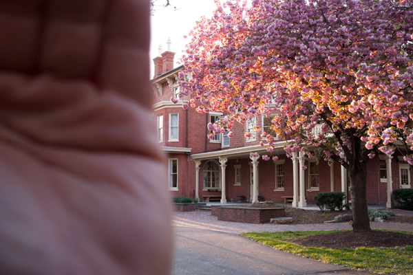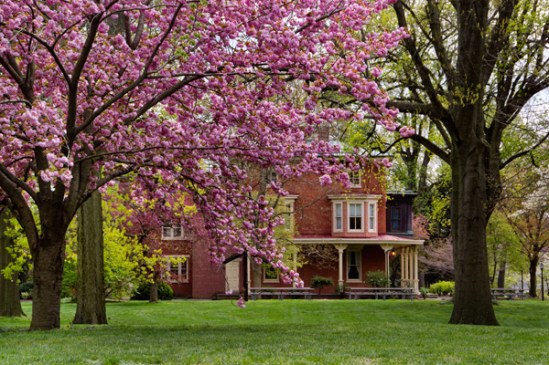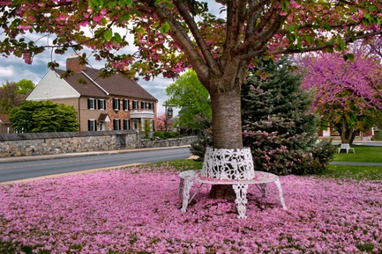 I had no intention of going out to look for photos yesterday, but plans changed and the opportunity arose to go out for a bit. I originally spent a few hours up the street from this location shooting a home that had blossoms covering the ground from a beautiful flowering tree that was dropping its blooms. Before I headed home, I took a stroll down the street and noticed this serene scene that was begging to be photographed. I asked the owner to walk in his yard, and he graciously said yes. The home across the street is a bed and breakfast called the Smithton Inn and it was built in 1763, and thanks to the efforts of its new owners, it is a wonderful place to stay for folks visiting the area. This yard had gorgeous flowering trees in purple,pink and white over the last weeks and I never shot anything, but something about the carpet of pink beckoned me to give it a whirl. The wrought iron furniture in white circling the trees added that touch of detail that brought it all together.