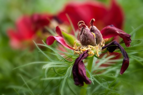 I thought that this peony bloom looked nice, even though it was totally finished blooming. Even at f11, depth of field is very minimal, allowing the background to take on a painterly look.