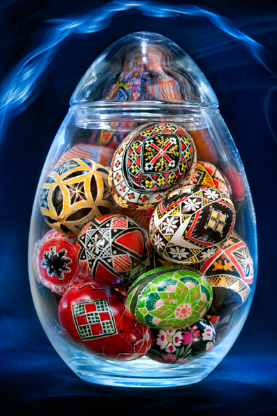 With Easter rapidly approaching, I noticed my mother in law had placed a glass egg with several painted eggs inside it on display in the dining room. I asked about them and it turns out they were hand painted by members of her family from past generations. The eggs are called Pysanky eggs and are meticulously painted using a wax resist method. To me it looks like something I would never have the patience to do, but I am very impressed with the ones done by the family. I have no idea if these samples would be considered good,great,average or whatever, but I enjoyed photographing them using my flashlight, which you will notice I decided to let the light streaks from it show in the final image here.