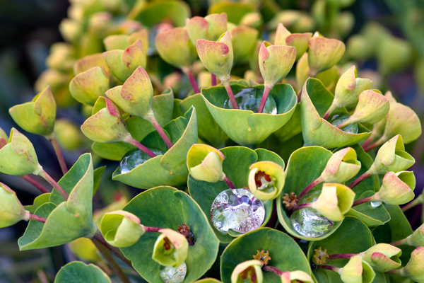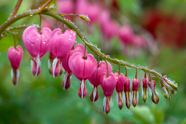 The bleeding hearts are beginning to get toward their prime in our garden and a light rain shower provided the perfect complement with glistening beads of water. I set up some wind barriers on two sides to keep movement to a minimum at slower shutter speeds. I like how the plant seems to open in stages, as evidenced in this image.