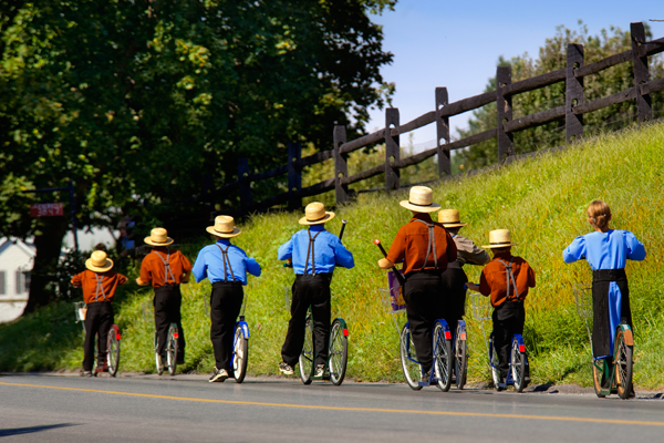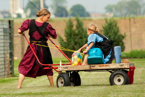 While I admit this is not the greatest image, it still shows the simple fun that Amish children have with the most basic items. This image was taken from a good distance away, and the girls were totally unaware that I was taking a quick photo as the one girl gave a tug on the reigns and the other reacted like a horse. It was comical to watch these two enjoying this imaginative horse-drawn game. I am not exactly sure but it appears they have added two red reflectors to the back of the buggy for safety.