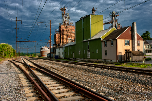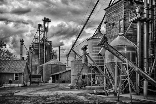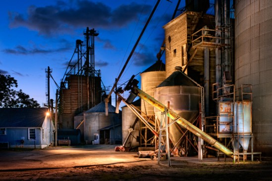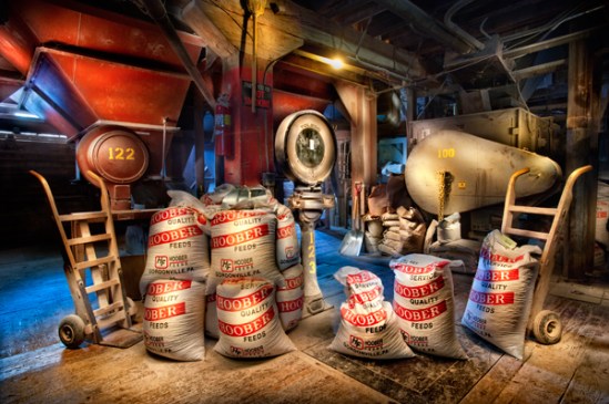 This image was taken at the feed mill that I had photographed and featured on my blog a few days ago. I met Brad the owner, and he graciously allowed both myself and fellow photographer Larry the chance to look around inside. After the mill shut down for the day, we broke out our gear and we each selected an area to light paint. Admittedly it has been a while since I gave this technique a try, so I struggled a bit as I worked to light the room with my spotlight. The mill is a real labyrinth of metal and wood, and left me wondering how such a place is designed. The inside also included numerous cats roaming about, which surprised me with all the machines at work, but after I had witnessed a cat catch a mouse three feet in front of me, it all became clear very quickly. The area I chose included the old scale with the two feed bags on it, along with another scale facing the opposite direction with the number 122 on it. The blue light is coming from window light that was shining in at dusk. We usually work in the dark, but time constraints had us shooting earlier.