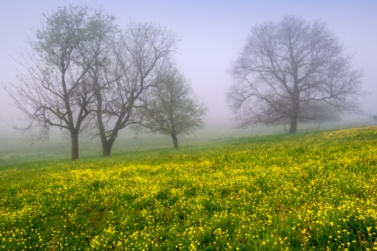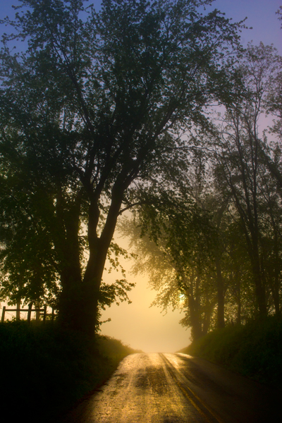 This is one of those images that frustrates me as I try to get it to look like it did when I shot it. The road was glowing from the previous night’s rain and the rising sun, and the sun was a nice ball through the fog,yet I could not get it to reproduce exactly like it was, so this is as close as it gets. I was hoping for an Amish buggy or some cool subject to be a silhouette in the opening, but unfortunately I was all alone on this foggy back road.