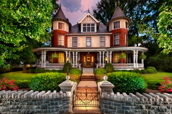 This lovely home is known as the Gonder Mansion, and is included on a local ghost tour in the area. It is a Victorian era Queen Anne style mansion built in 1905 by big wheel Benjamin Gonder, and was the home for him and his wife mary. It’s said to be haunted by the spirit of a woman who committed suicide – Annie, Benjamin’s loco sister who lived on the grounds but was shunned by the rest of the family because of her mental condition. It’s reported that the sounds of music and crazed laughter can be heard throughout the home, and her misty form has been reported haunting its corridors. She moved into the mansion in death after being forbidden to step inside the home during life. I did a small bit of light painting to highlight the gate,wall,and bushes at dusk to add my own touch to the beautiful home. The wrap around porch looks like a great place to sip cold lemonade on a summer day. I shot this from my truck roof using my laptop in the hopes of offering a better perspective.