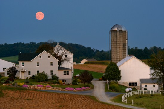 This is last evenings blue moon as it began to rise behind this local farm. From what I understand the term refers to the second full moon in the same month. I decided on this location after conferring with the photographers ephemeris, which shows sun/moon rise and set for photographers planning shoot locations. By moving to camera right about 40 feet,the moon was coming up right between the house and barn,but the tree on the right was blocking the barn,so I had to go with this instead.Shot from my truck roof,which had the Amish wondering who this nut was on top of his truck.