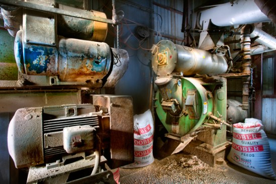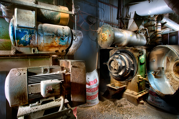 Once again I was trying my light painting technique in the old feed mill. This time I was photographing what I think is called a pelletizer, which makes feed pellets and the two images show the machine in a closed, and then open position.The bottom photo shows the machines main part,which has a series of holes that form the hardened pellets. The room was very warm so I assume some heat process is involved as well. To do the two images,I first completed the scene with it closed and then simply opened the door for the next part of the shoot. Then I brought that image on top of the first and blended them.