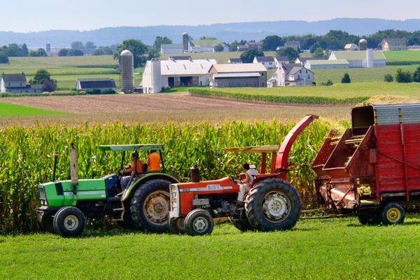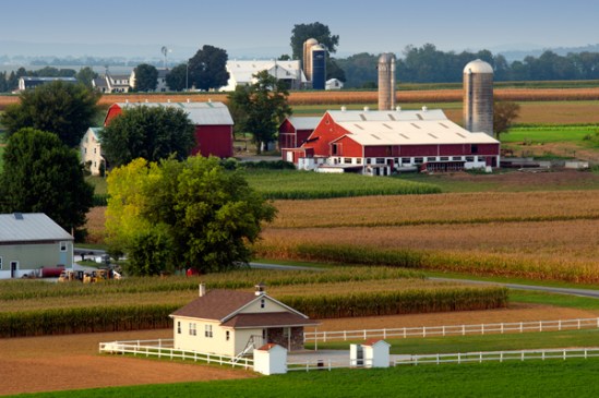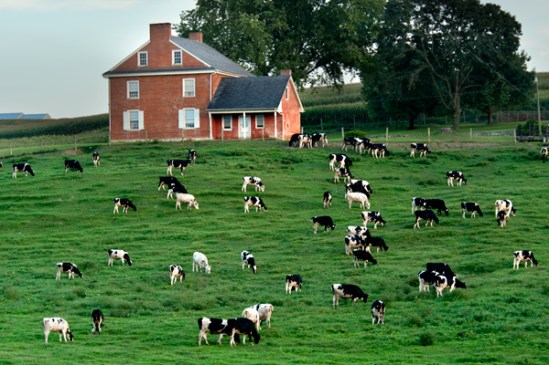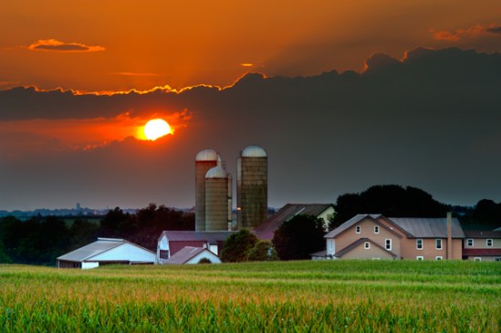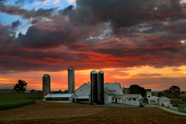 A new day begins on an Amish farm as the sky overhead begins to light up from the rising sun. A light in the barn signals the beginning of the first cow milking session,which must be done more than once a day.The field in the foreground was filled with corn last week,but as fall approaches,the harvesting becomes more frequent across the landscape.
