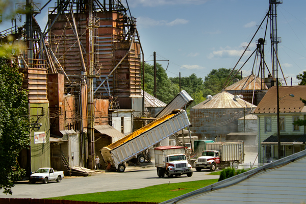 This is yet another image of the mill as work goes on throughout the day. I was told the truck on the left is called a hammer mill, which as I understand things,mixes the various feed components on site for farmers. The sun came out briefly to illuminate the trucks while the grain silos remain in shade.