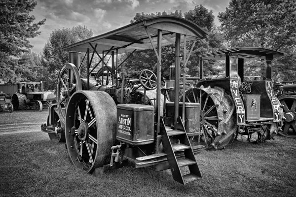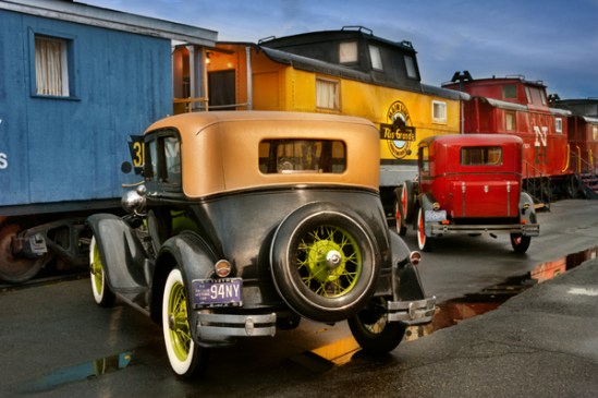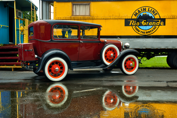These old cars were part of a car club that was out touring the farm country,and I happened to spot them parked at a motel that is totally comprised of train cabooses. Each guest spends the night in his very own caboose, which come in every color under the sun. The evening was basically pouring rain,but after shooting under an umbrella for 30 minutes,the rain stopped and I began lighting the scene with flash. I thought the two modes of transportation complemented each other and harkened back to a simpler time.The yellow caboose is the Rio Grand.