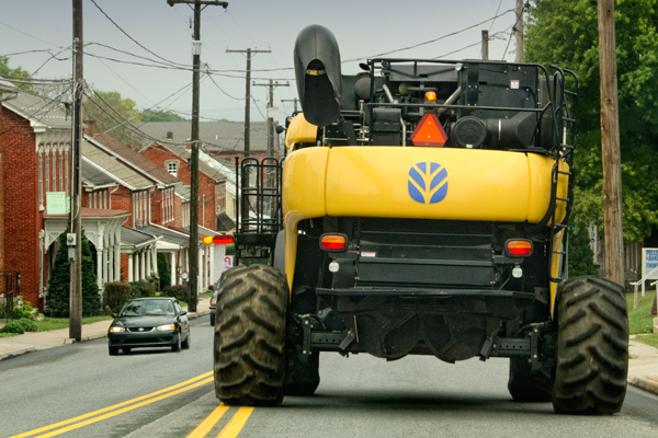 Ever feel tiny and insignificant? Well that’s probably how the driver of this compact car felt as he hugged the curb and kept a little distance between himself and this rolling monstrosity. This huge Combine was on the move through several local towns recently as it made it way to the next cornfield for more harvesting, and it raised eyebrows more than once as it dominated the road. I shot this through my car window after I was lucky enough to get directly behind it. The only thing better than this would have been a smart car beside it,which would really look ridiculous.