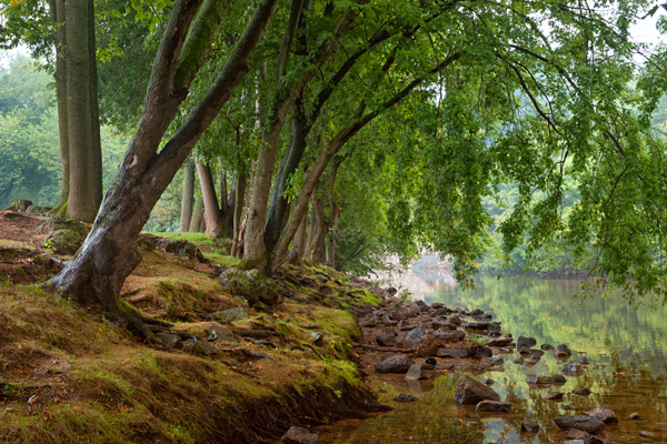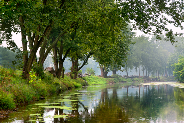 This is a photo I took after putting on the hip waders and going out to about mid stream. The creek is a little lower than normal right now,so I was not worried about getting knocked over by the current,and it provided a nice vantage point during a slightly foggy day. Depth was anywhere from 8 inches to about 2 feet,which allowed me to navigate anywhere on the stream I needed. I carried only one camera with lens on my tripod and brought a polarizer,which helped with the reflection.
