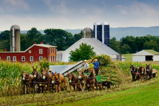 This is another classic fall scene from the heart of Amish country featuring farmers hard at work bringing in the corn harvest. Pleasant temperatures and a mild breeze made for the perfect day to be out in the fields. A full complement of farms and silos provide the perfect backdrop to the men at work in the foreground.