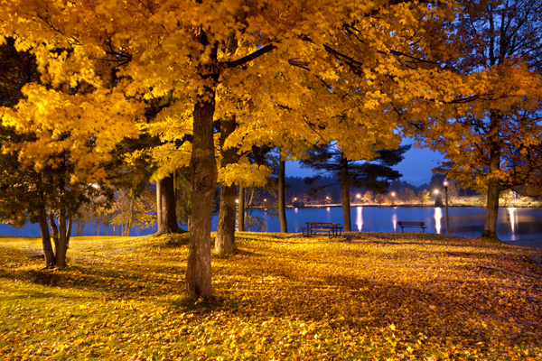 This Lake Placid park was full of color, but with twenty-mile per hour wind and driving rain,I was wondering why I left my warm motel room an hour and a half before sunrise in search of images. All the light in this image is coming from lamp posts throughout the park and my exposure for this image was thirty seconds at f11. Several early morning joggers gave me funny looks as they wondered what on earth I was doing.This image was taken shortly after I finished my streets of gold image from yesterdays post.