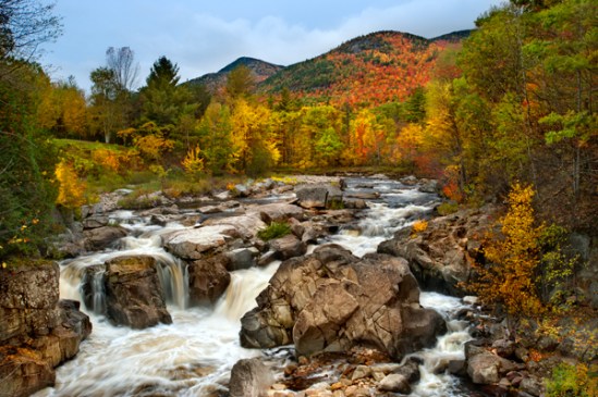 This falls called the flume is located along a scenic stretch of road about ten miles outside of Lake Placid. As I get older I seem to be getting a little less brave or perhaps wiser,but on this morning I decided to navigate my way onto a hard to reach rock outcropping to get this shot. To get this shot,I left my camera bag in the woods,carried only my camera and tripod and clung to several trees as I descended a hill.Next I crawled on hands and knees along a two foot wide rock ledge that included low hanging roots brushing my back.I took my sweet time getting there because any mistake would put me into the raging water,which included more nasty falls just downstream. Getting there right after sunrise insured I would hopefully be there alone,which I was.The water was flowing pretty strongly,so extreme caution was in order.Fall color on the mountain provided a nice backdrop.