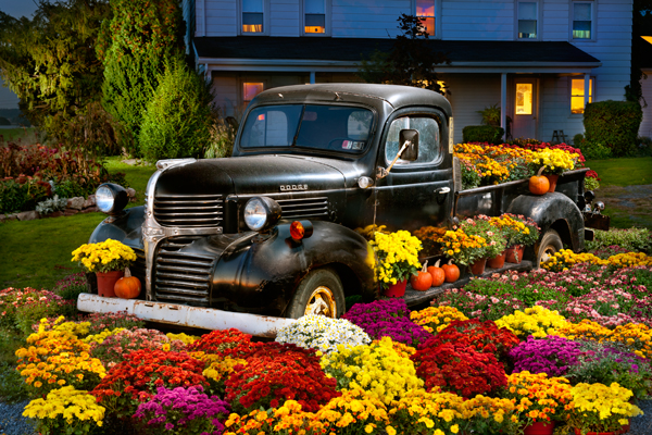 This old Dodge has been part of a local fall roadside stand for several years and this year I finally set aside a night to photograph it. The truck bed is full of mums and a wide variety of colorful mums fill the foreground for customers to pick from. Let me explain how the shoot went.I arrived an hour before sunset so I could set up the tripod,fill in any empty holes with flowers if needed and start my laptop to fire the camera. First the laptop took 5 minutes to let me log on,then my camera control software would not recognize that my camera was attached. After no less than 6 restarts,the sun was now below the horizon and I was now ready to drive over my laptop.