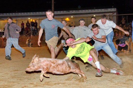 I rarely post photos that are not on the visually appealing side, but since I have viewers from all over the world,I thought I might share one of the more interesting activities that takes place at the local fair each year. What you see here is known as the pig chase,where contestants compete to catch a greased pig. Some times the pig takes a good hit as he is tackled,but in twenty years I have never seen a pig or person get hurt. Pigs seem to be pretty tough from what I have seen,and the addition of lard on their bodies make them hard to hold. From children to adults,there is a size of pig that matches each division,and believe it or not,I have seen pigs actually run with an adult hanging on their back. For children under five,there is a rooster chase,which really gets interesting,and by the way,the guy in yellow did not catch the pig. Being the fastest at this event often times means you are the one that will be feeling ten other guys landing on your back in short order.