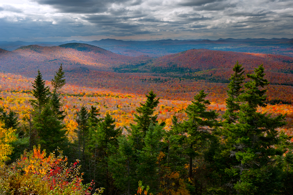 This is a view along the way up to the summit of Whiteface mountain near Lake Placid. It cost twelve bucks to drive up to the top and it was a nice drive but photo ops were tough.The valley had decent color but the distant views were somewhat hazy. This is the kind of road you pray all the way up and down that your brakes don’t fail. Sidelit pines add a little foreground interest to the view.