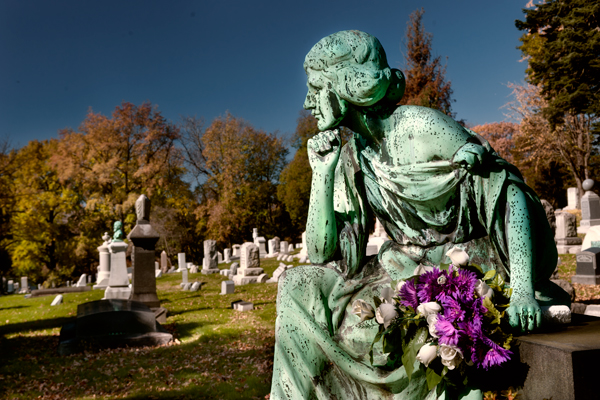 This statue sits on a grave overseeing a section of an old cemetery in Pennsylvania. Colorful flowers have been placed in her hand by an unknown person,and I found that the green aged patina on the statue contrasted nicely with the purple and white bouquet.