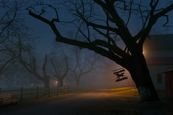 This property is an ideal backdrop for the sleigh and the building on the left was actually hand-built by the owner and his son several years ago. I put a light on a stand in that building to shine light out the window across the snow toward the sleigh and lit everything else with flash. From the light illuminating the sleigh to the shadows on the roof from the pine tree,I had to light every element. The old lantern was provided by the property owner as well,and the fancy gift packages and decoration on the sleigh was courtesy of my wife.