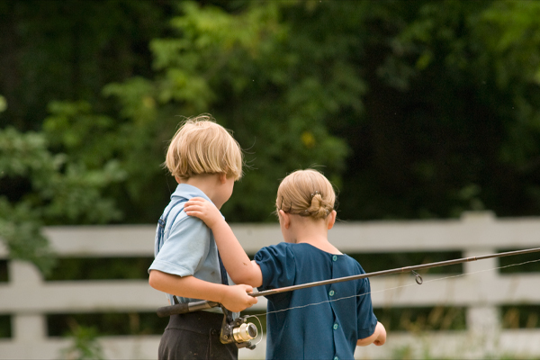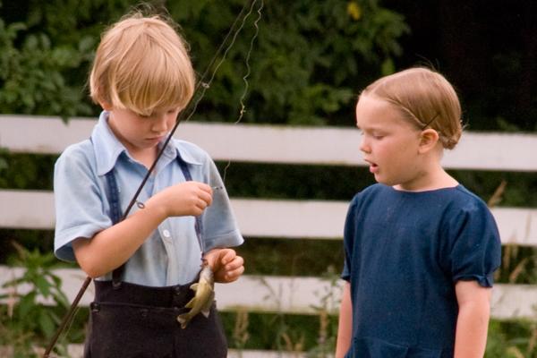 This Amish boy and girl are at the local watering hole to spend some quiet time with one another and a rod and reel.As the tale unfolds,his confidence is very shaky,so she puts a reassuring hand on his shoulder and says I believe in your ability to land one, and just like that he has a tug on the line.She says I told you so and then with a bit of apprehension she moves in to watch him take it off the hook.Shot with a 500mm from a good distance.