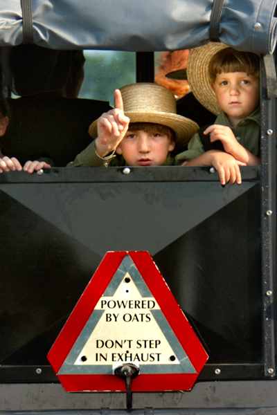 This buggy caught my eye as I passed it on a quiet back road, so I pulled over and left it pass me and I captured a few frames as the message on the rear triangle came into focus. It says, “powered by oats,don’t step in exhaust”. I must admit that although I have lived in this rural community all my life,there are many things that I am still not sure of in relation to Amish life. They certainly are similar in many respects to the general public, but are worlds apart in other aspects. I have come across Amish who are very kind, those who are friendly,the occasional nasty one,and every type in between. They have a sense of humor,as evidenced by the sign, and hopefully folks who visit the area realize that TV shows like Amish mafia are absolutely ridiculous and should not even be on the air. The real Amish are right here and worthy of respect. The youngster looking out the back is either gesturing that I can take one photograph, or I am about to be scolded.