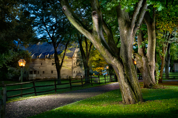 A wireless flash and camera remote are key to being able to move about the scene as needed and a laptop with software to control shutter speeds insures the camera remains fixed and does not shift while shooting. One important note is to remember you are adding highlights only,so when you light things with your light,you are not using shutter speeds that let ambient light mess you up. In other words if you have flash along with a bright scene,you will have everything lighter showing up when you brush in,so for example the tree trunk is lit against the dark roofline and if I had shot at a shutter speed that showed the roof detail, it would show up as well as a highlight.This is really a simple technique but you need to keep your wits about you while you do it.