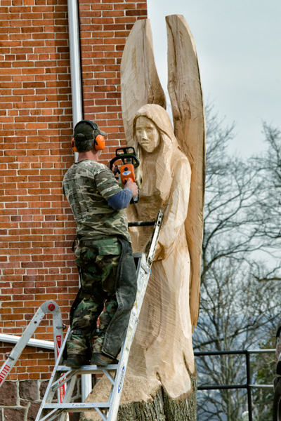 This brand new chain saw carving was just finished in the last few days and showcases the artistry of Dean Fox, a man with a unique gift and the vision for seeing something special within trees that are past their prime and destined to come down. This angelic figure was carved from a large tree that had died and church members decided to have this done with the large remaining trunk. One church member commented to me that the tree had a huge lean to it,but with the artists skill,it now appears straight.Thankfully a church member met me this evening to turn on the sanctuary lights,which I felt was important to bring the photo to life. The fresh lacquer gives it a strong golden glow,but that will fade over time. The bottom photo shows the artist in the beginning stage of carving with his chain saw. John 15:5-I am the vine; you are the branches. Whoever abides in me and I in him, he it is that bears much fruit, for apart from me you can do nothing.