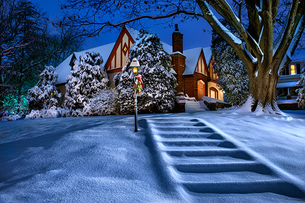 Photography can be a very satisfying endeavor when you express your creativity and bring a subject to life such as this image.This was the last real snowstorm for this winter and I always liked this home for its unique charm so when I saw the faint form of the snow-covered steps as I drove by,it set the wheels in motion to ask if I could try a shot. The owner gladly obliged and I set off to light the scene as I envisioned it. This shot ranks right up there among my favorites for this winters shooting and compositionally everything works in harmony. There always seems to be a twist to my endeavors and after I knew I had captured the un-tracked snow,I headed up into the yard to begin lighting the house,when all of a sudden I hear a guy say in a rather gruff manner-who are you?, to which I shot back who are you? He says it’s not my property and wants to know what am I doing in the yard? I tell him I have permission and then his demeanor becomes a little more amenable. He tells me he is just looking out for his neighbors,which is understandable.