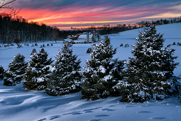 This set of images are from the same location,with the top view featuring the front of this private home and the second image of the pines and farm at sunset is the view out the back yard. I originally stopped to ask if I could shoot the view of the farm but then thought maybe I could do a neat shot of the house as well. At one time the main stone building was located about a mile away and was called the Bethany one room school which was built in 1858. The current owners saved the old structure by dismantling it and having it rebuilt piece by piece at this picturesque location. The bell on the roof adds a nice touch and thanks to the cooperation of the owners allowing me to go in their home to shine a light out the window,I was able to accomplish the lighting I had pre-visualized to get the shot here. I took this set of images this past weekend and the snow is practically gone at this point.
