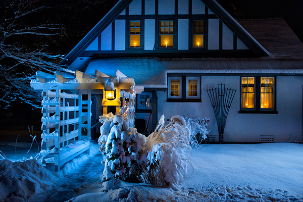 This set of images were taken during the last winter storm of the season,and I shot these around nine thirty at night. The long exposure recorded some color in the night sky which surprised me but it helped complete the images. Usually storms like this don’t hang around long but the snow hung on trees for about two days,which gave me ample time to capture some nice images. This quaint home with its red door,lovely architecture and snow-covered fence made the perfect subject on this rather still winter night. The view of the front required me to light the snow with flash to overwhelm a very bright street light that was casting a terrible shadow across the snow. The bottom photo includes a trellis with a lantern and that is what originally caught my eye as I was driving by because of the warm light against the cold blue of the snow.