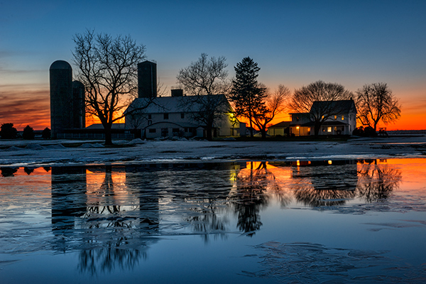 This is one of those scenes that makes me want to go back over and over again because of the unique situation and the possibilities it presents. I started the day many miles away trying for a sunrise shot and when that fizzled out,I just started driving and looking and this scene caught my eye as I drove by. The sun was just starting to illuminate the farm in the bottom photo at sunrise and the ice was reflecting the color nicely. We recently had heavy rain and snow melt which filled this farm field that is usually dry. After thinking about the image all day I decided to return for a go at sunset.
