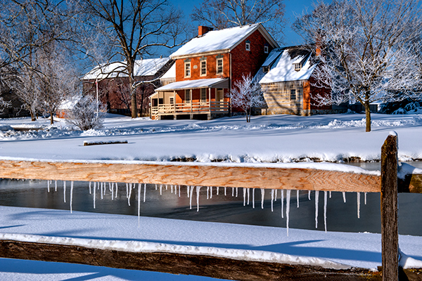Another view of the country property I shot recently and by triple threat I meant within the image there is snow,ice and even hoarfrost on the trees. The hoar-frost can happen on bitter cold nights were wind is non-existent and the right combination of moisture in the air along with cold forms a sort of frost effect on trees and other objects. For anyone making mental notes on improving your own photos I want to point out that choosing the right angle or vantage point can make or break a shot.In this image I lowered my tripod till the icicles on the split rail fence were exactly against the dark pond area,and being lazy and just snapping a quick shot would have put them against the white snow and you never would have seen them.The funny thing on this shot is the icicles were only on this one rail and the fence was a couple hundred yards long.