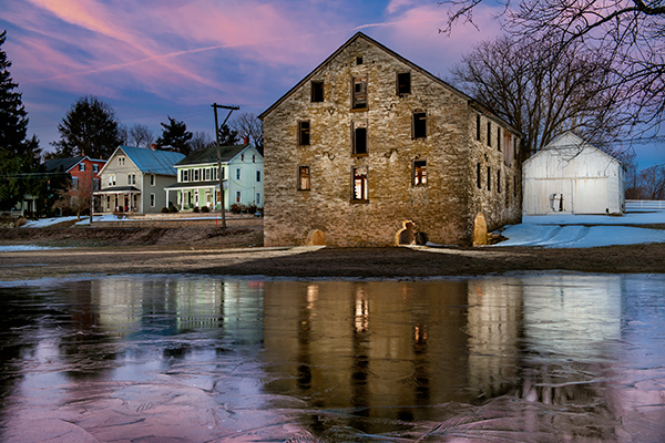 This is another image I captured after looking for water collecting in fields this spring. This old mill sits right along the road and with just a short walk down the bank here,I was rewarded with the morning sun creating this lovely reflection in the ice.A barn across the street adds to the composition in this country scene that would make a gorgeous painting.