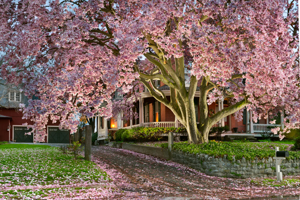 This is one corner of our garden and after the tree dropped all of its colorful flowers last week and blanketed the ground in pink petals,I decided to get the camera out and light the scene.The three gazing balls were placed into the bird bath and backlit to show their color and this shot was one of only one or two I took this spring.
