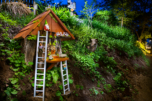 Not my typical photo subject but since I made it,I Figured I would share it. We live beside a rail trail that is almost finished and after years of planning,debating,arguing and worrying,the trail has turned out pretty nice after all. Our property is at the top of this hillside and since we had this old stump sticking out on the hill,I figured I would build this little gnome home to give trail users something to visually enjoy. I made the roof,ladders,balcony and added some tiny benches,bikes,gnomes and railroad spikes to commemorate the old railroad that once ran here.So far everyone that sees it really has enjoyed looking at the little imaginary world where tree stumps are homes. I shot it at dusk and lit it with my spotlight.