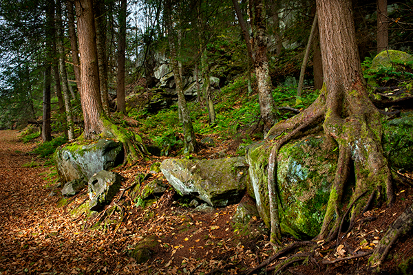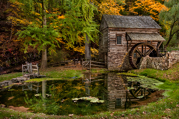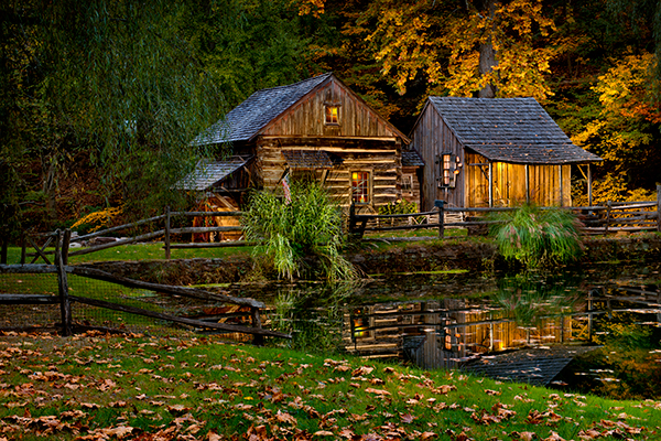 This scene is located in the quaint town of Lititz ,Pa and features a home that used to be a church. The autumn leaves were simply stunning as they covered the sidewalk and steps and the addition of lanterns really rounded out the shot.The owners were very gracious in letting me shoot this image and gladly turned on the light inside the stained glass area to help illuminate it.I saw this shot in the morning and could not stop worrying that the leaves were going to get cleaned up before I returned at dusk. I actually had two tripods set up,with one holding an umbrella over my camera while I lit the scene in the rain. The nice thing with the rain was the leaves were full of rich color from being soaked. of special note,the blue on the right is the sky,while the blue on the left is the roof reflecting night sky color