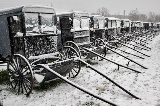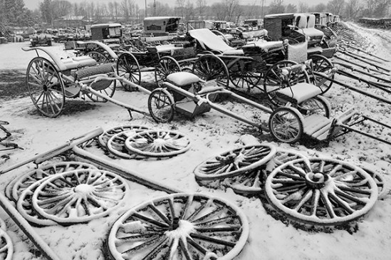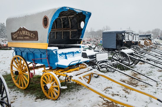 I snapped this image before the local Mud sale officially got under way this weekend. For those not familiar with them, mud sales are held in Amish country in the spring and get their name from the typical muddy conditions of spring. A snow storm came through the day before and coated these buggies that are lined up for purchase at the auction. I just did not have the desire to battle temperatures in the low 30s and winds of 20 mph during the actual event,so this will have to suffice.