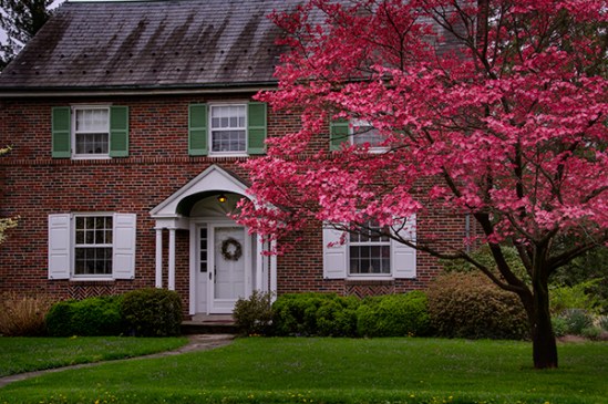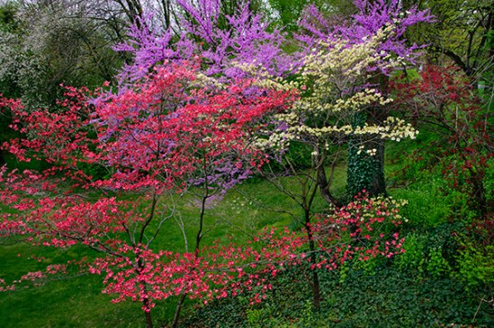 I have always thought this gazebo was very nice and when I saw the spring trees in bloom around it, I knew I had to ask permission to try and capture it. This was shot with a long lens between 300 and 400mm so I could place the colorful trees against the dark woods behind them instead of the bland sky which would have lost some of their color.A longer lens helps compress the distance to help get a great shot. Thankfully the owners were more than willing to let me try to capture this beauty.